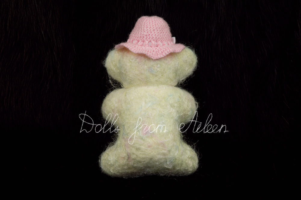Beatrice is an OOAK needle felted teddy bear. She has been made using acrylic fibers. I have crocheted a cotton hat for her, decorated with a ribbon. She is 8cm tall, with her hat. The hat is sewn to her head, so cannot be taken off without hurting Beatrice. I have given her a bell on a cord that can be untied.
